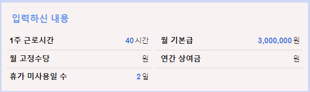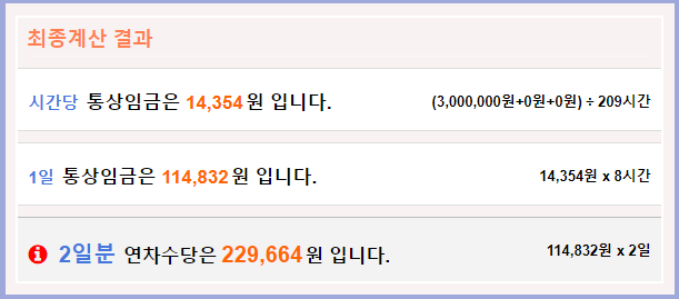 만약 1주 40시간 근무하는 근로자의 기본급이 3백만원이고 남아있는 연차가 2일인 경우 총 받을 수 있는 연차 수당은 229,664원입니다. 정확한 계산은 사이트에 접속하여 필요한 정보를 입력한 후 조회해볼 수 있습니다.
